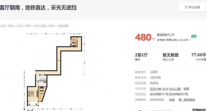 这套房源目前就挂在网上,是上海长宁区中山公园的二手房,标价480万。