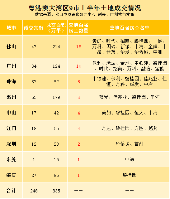 数据显示,粤港澳大湾区9市在今年上半年,成交了835万平土地,占全国的8.5%。