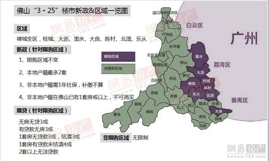 广佛两城紧密相连,北至三水大塘、南至顺德容桂,都与广州城界有相交,但人们平常说的“广佛交界板块”,大多指佛山去年3·25新政中圈定的限购区域。