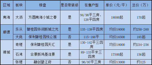从总价来看,限购区的在售户型以三四房为绝对主力,加上不低的单价,总价基本都在150万/套以上,唯独禅西板块还有100-150万/套之间的房源可选。