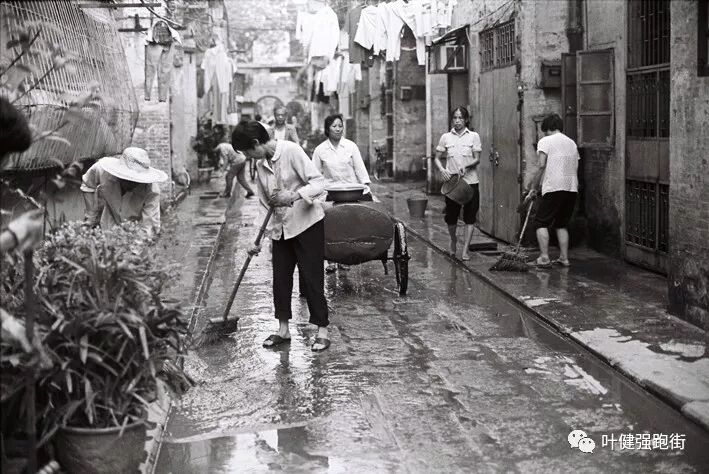 ▲ 洗街哟!街坊左邻右里,你提水桶,我拿扫把,打扫干干净净过新年(1994年摄于广州宝源大街)