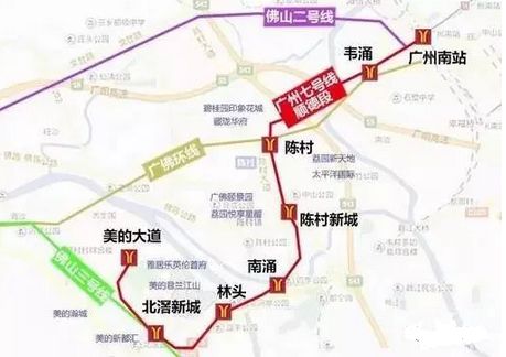 广州地铁七号线西延线是由广州南站出发,途径顺德陈村、至北滘,全长13.4公里,共设8座车站,其中在广州设一个站——韦涌,其余七站都在顺德,自西向东分别为:美的大道、北滘新城、林头、南涌、陈村新城、陈村、陈村北。