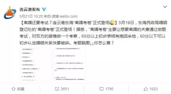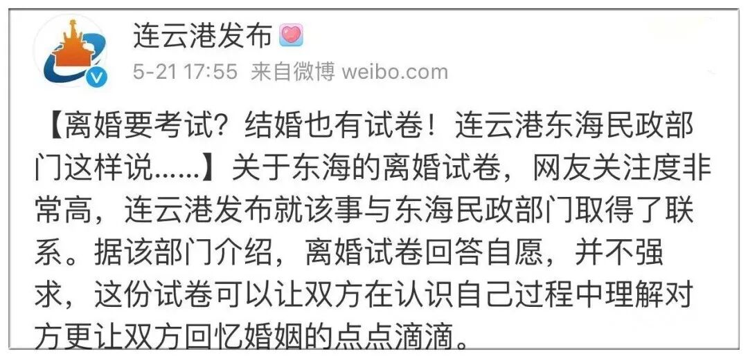近日,江苏东海民政局“离婚考卷”正式登场。