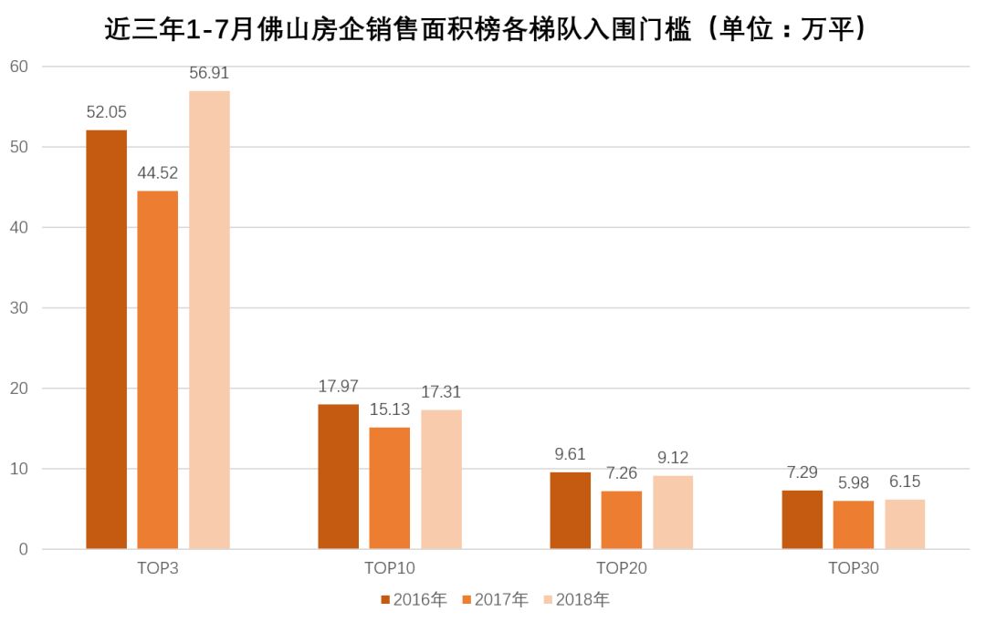 纵观近三年1-7月佛山房企销售面积榜各梯队,2018年上半年TOP3的门槛为56.91万㎡,入围门槛高于近三年,比三年中处于低位的2017年要多12.39万㎡。其余TOP10、TOP20和TOP30的入围门槛,均位于近三年的中位,均高于2017年,低于2016年。其中TOP10的门槛较2017年提升了2.18亿元;TOP20的门槛比2017年提高了1.86亿元;TOP30的门槛则是比去年提高了0.17亿元,近乎持平。