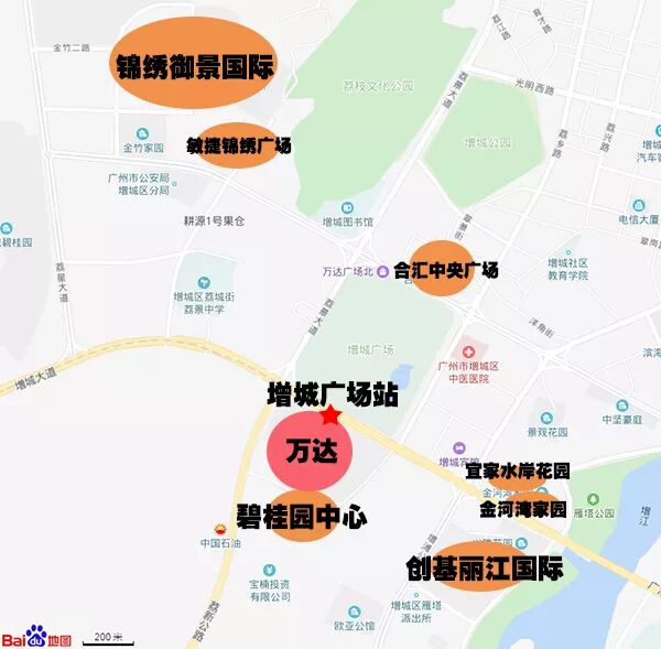 该片区是增城的行政中心,也是增城市政配套比较集中的板块。增城中医院、增城图书馆、增城博物馆、增城广场、增城人民检察院、广州市公安局增城区分局……嗯,能想到的行政办事处及市政配套都在这方圆1-2公里之内。