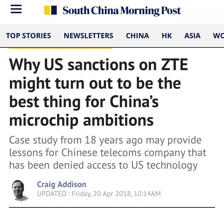 《南华早报》评论文章则认为,置之死地而后生,中兴遭受的重创有可能成为中国的一次机遇。