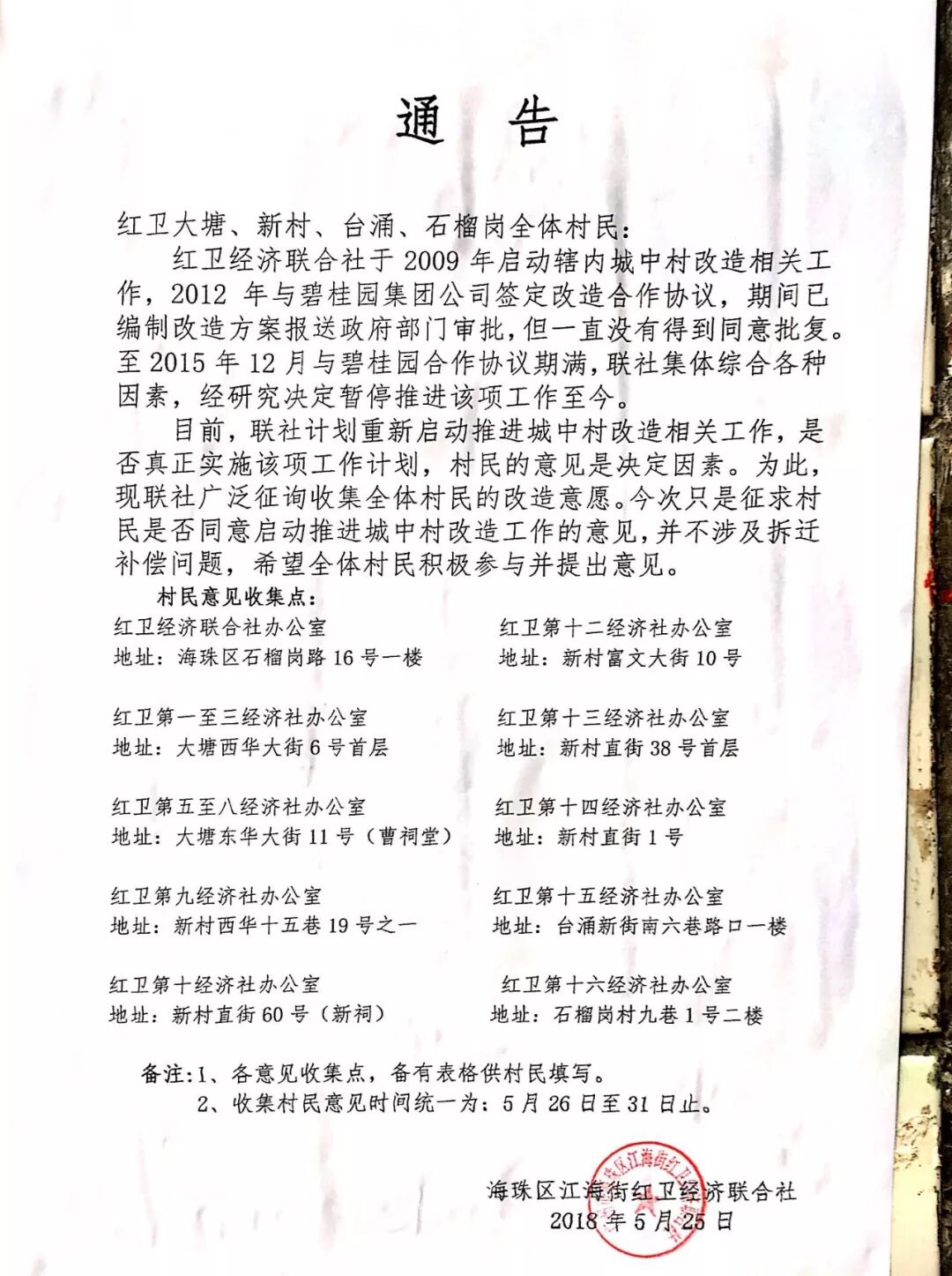 海珠红卫村联社于近期启动了整村城市更新改造意愿、改造方式、改造模式表决工作。