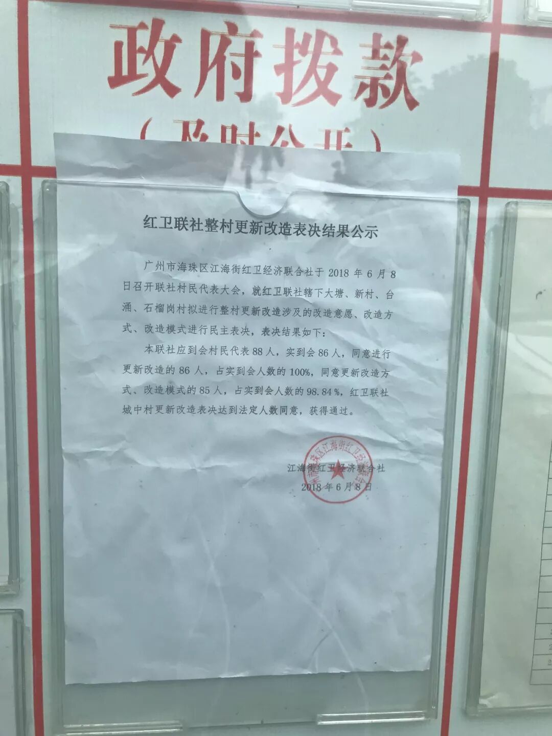 最终结果显示,同意改造比例达98.84%,满足了广州城市更新政策的所规定的法定人数,获得高票通过。