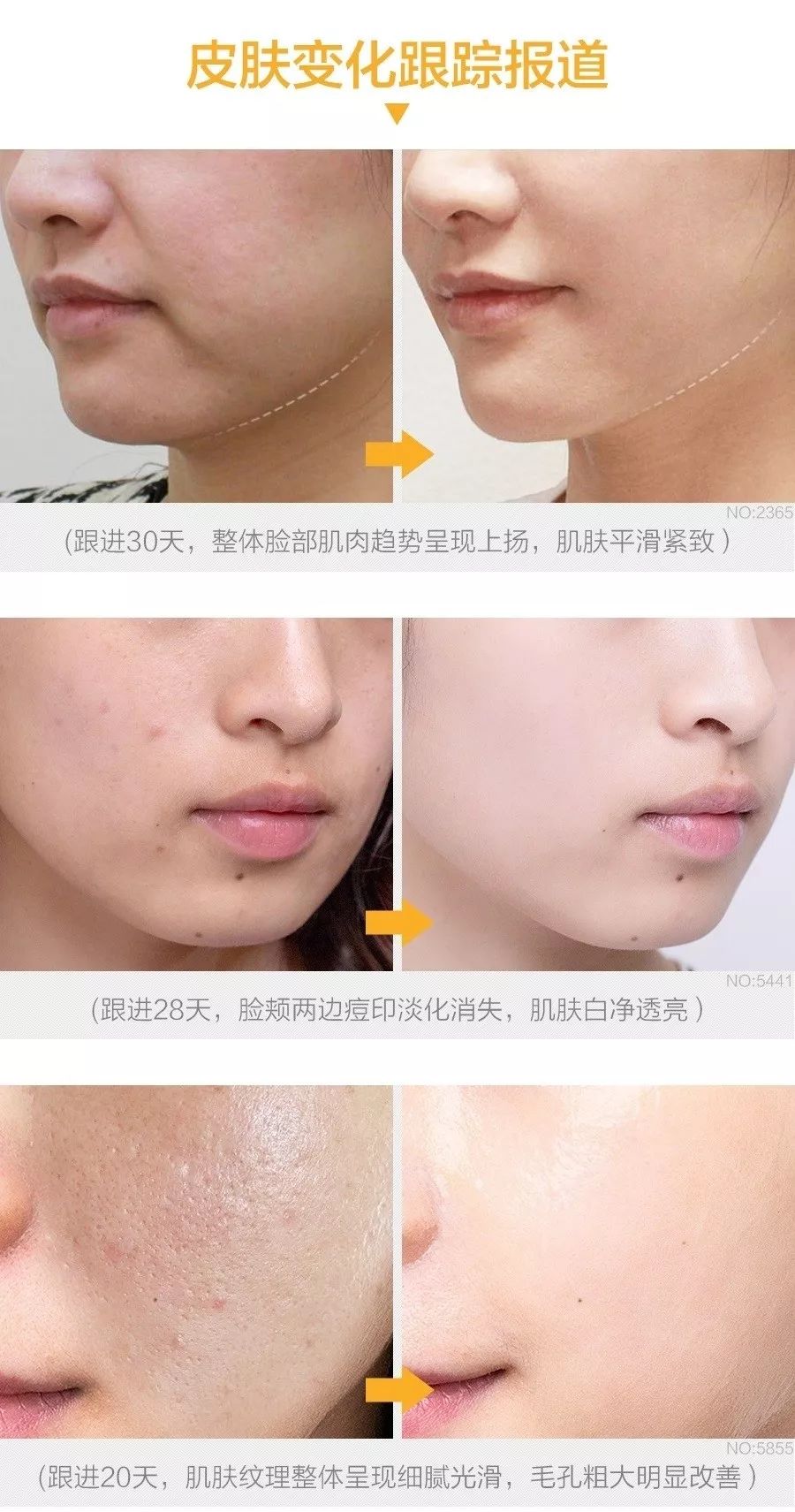 医美级「涂抹血清蛋白」精华,节目组还放出了体验者的两周的跟踪测试报道: