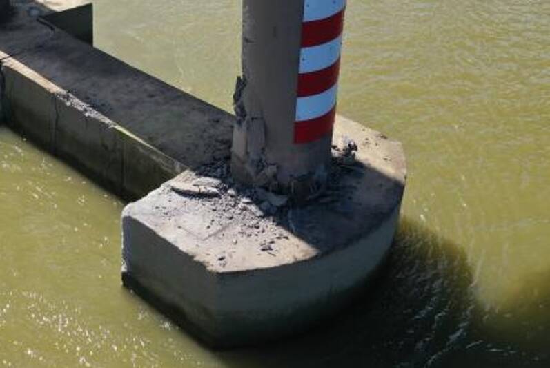 据广州海事局称,13日早上6时05分,从广州新港东江仓拟经浮莲岗水道、沙湾水道、容桂水道、虎跳门水道等驶往珠海高栏的内河集装箱船“新谷333”,在航经番禺沙湾水道北斗大桥时,触碰大桥桥墩,造成一桥墩受损,该船船体轻微受损,未造成人员伤亡和水域污染。