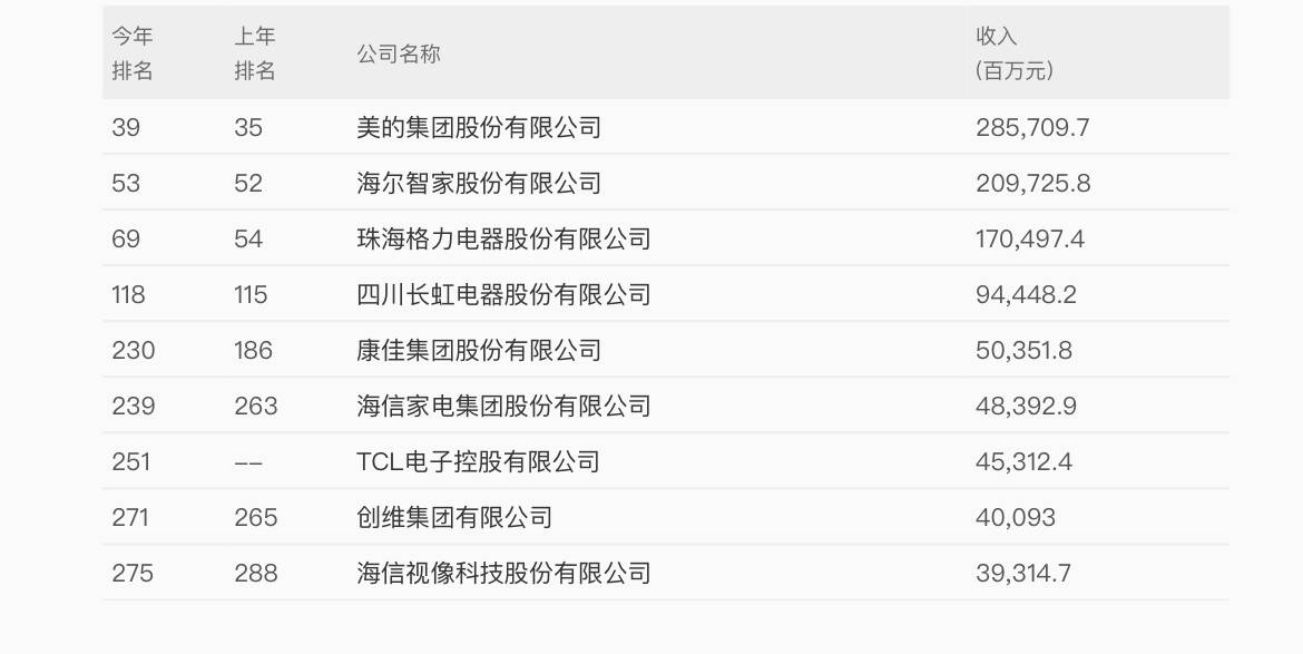 除美的外,海尔智家营业收入约304亿美元排名第405名,较去年排名上升30名。珠海格力电器股份有限公司营业收入超247亿美元排名488名,较去年排名下降52名。(更多新闻资讯,请关注羊城派 pai.ycwb.com)