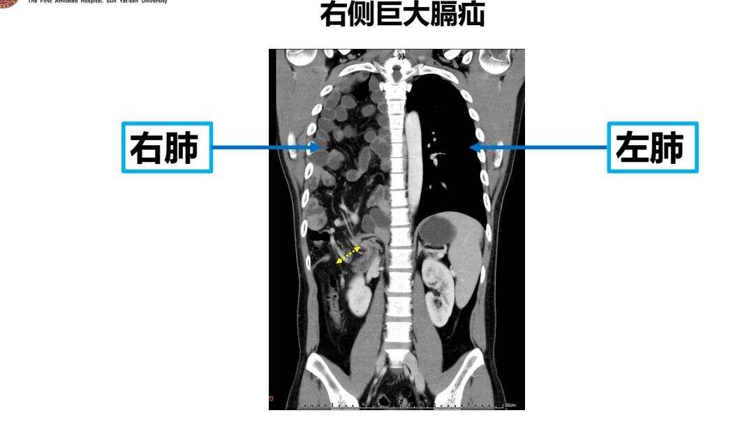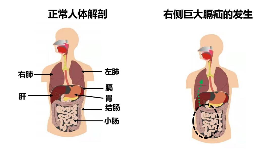 影像学检查发现:林先生2米长的小肠、阑尾、大肠已经把他右侧胸腔挤得满满的,右肺被挤成了一小团,几乎没有了功能,难怪他这几个月一运动就感到气促。而且肠道异位后也导致他食欲不振、体重持续下降。