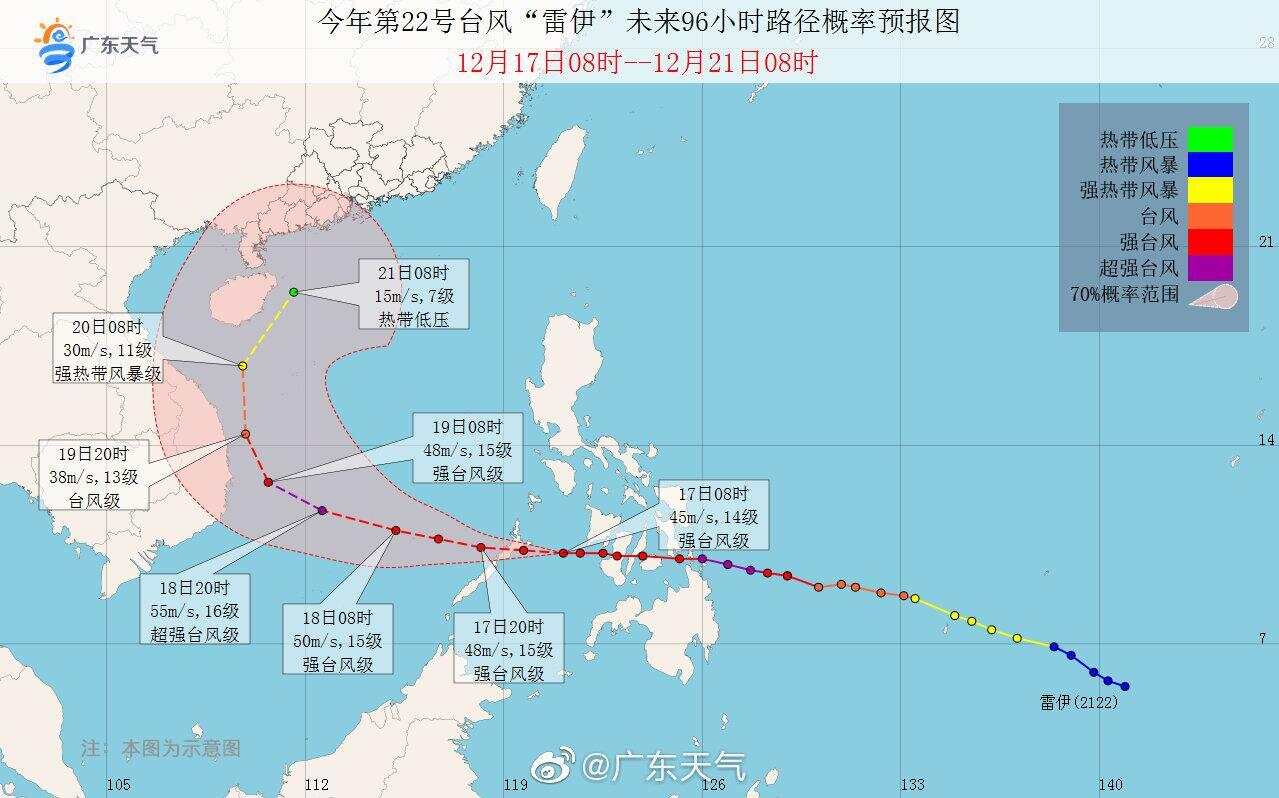 根据广东省气象台的监测,“雷伊”12月18日8时中心位于西沙永兴岛东南方约740公里的海面上,中心附近最大风力15级(48米/秒,强台风级)。该台预计“雷伊”将以25到30公里的时速向西偏北方向移动,12月19日起将逐渐转向偏北方向移动,向海南岛东南部海面靠近,强度减弱,并将于12月21日在南海西北部海面减弱消失。